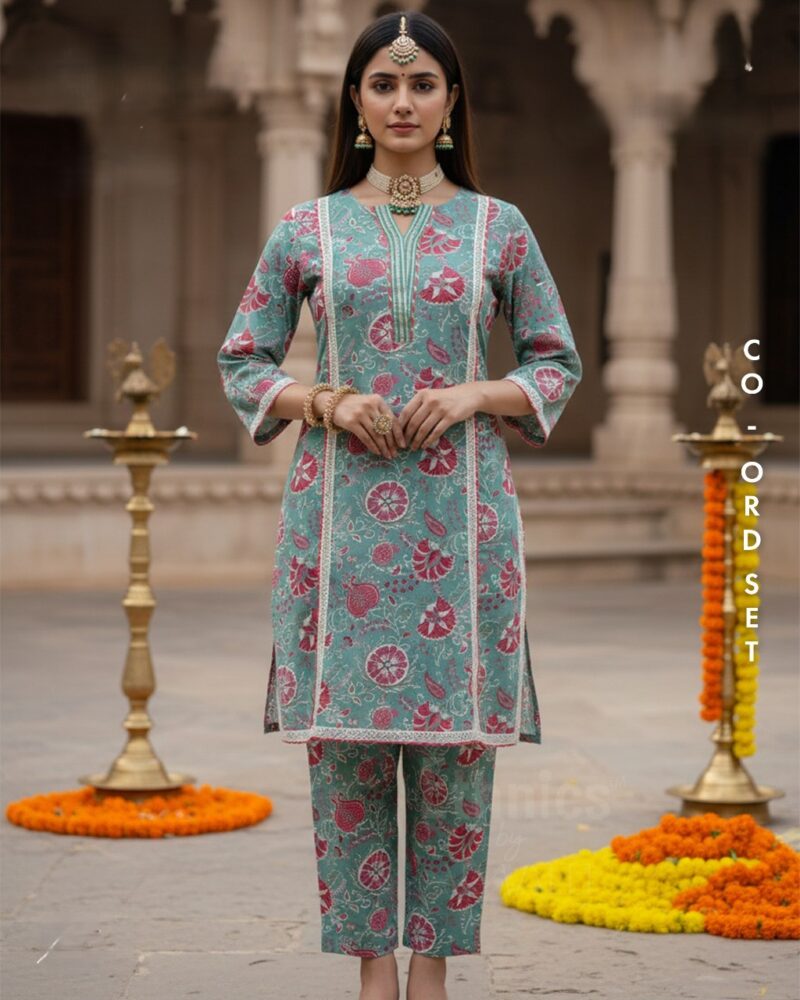 A stunning pastel green cotton co-ord set featuring intricate traditional prints and handcrafted detailing. Lightweight, breathable, and stylish