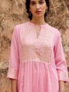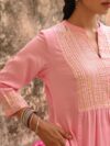 A soft pink cotton kurta–pant set adorned with delicate gotta work on the yoke and sleeve cuffs.