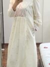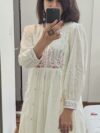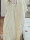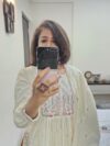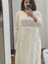 The kurta features delicate pastel thread work, hand-embroidered florals, and a lightly gathered flare that enhances its feminine appeal. The matching dupatta comes with scalloped edges and dainty embroidered motifs, adding a refined finishing touch. Paired with coordinating bottoms, this ensemble delivers a sophisticated, soothing ethnic look in a serene off-white/cream tone.