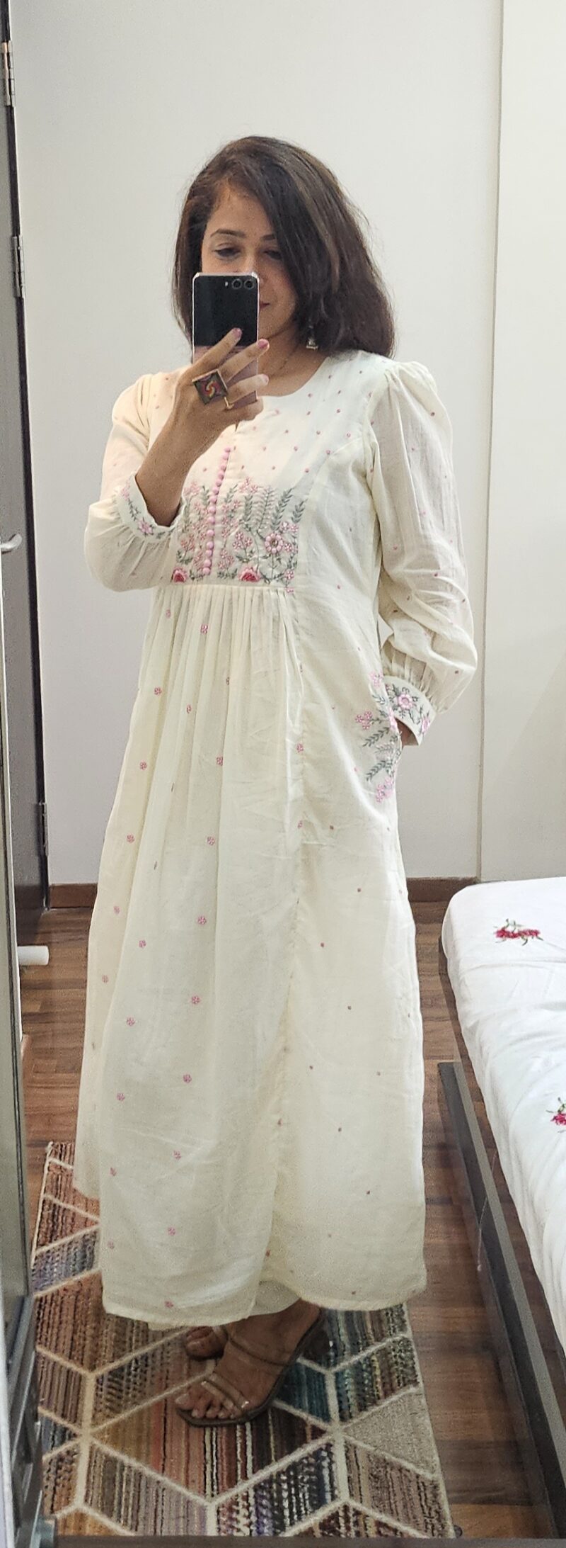 Pocket at both sides in kurta , thread work on pockets.